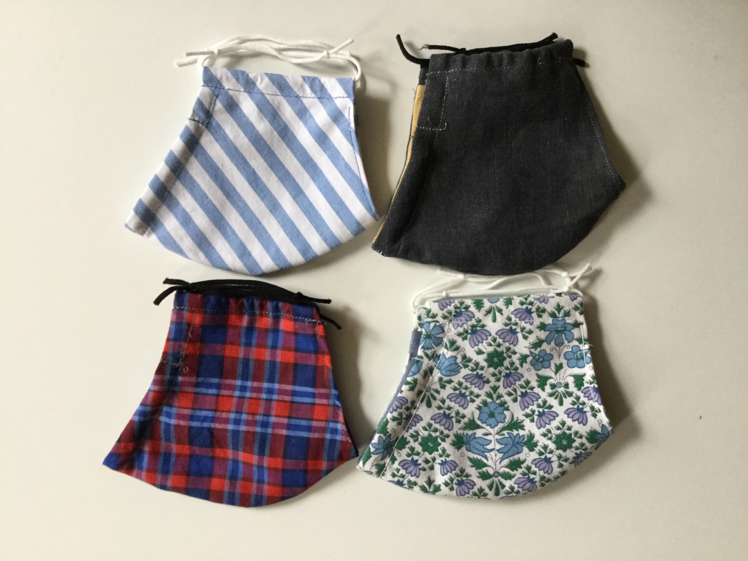 They come in a wide variety of fabrics, masculine, feminine, frivolous, and sober.  They have adjustable elastic around the ears, a metal strip to bend across the nose for a better fit, a pocket in which to insert a paper towel or filter for added protection, and they are fully washable.  They cost £4 each payable in cash or by bank transfer.  If you would like to order one or more and can't make the sale please emailsuewhittington@hotmail.co.uk
